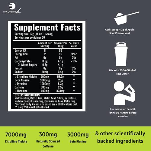 Endeva Nutrition Pre-Workout 2.0 | Increase Energy, Power, Fatigue Delay | Caffeine, Beta Alanine, Citrulline Malate,L-Tyrosine,L- Theanine (Sour Apple)