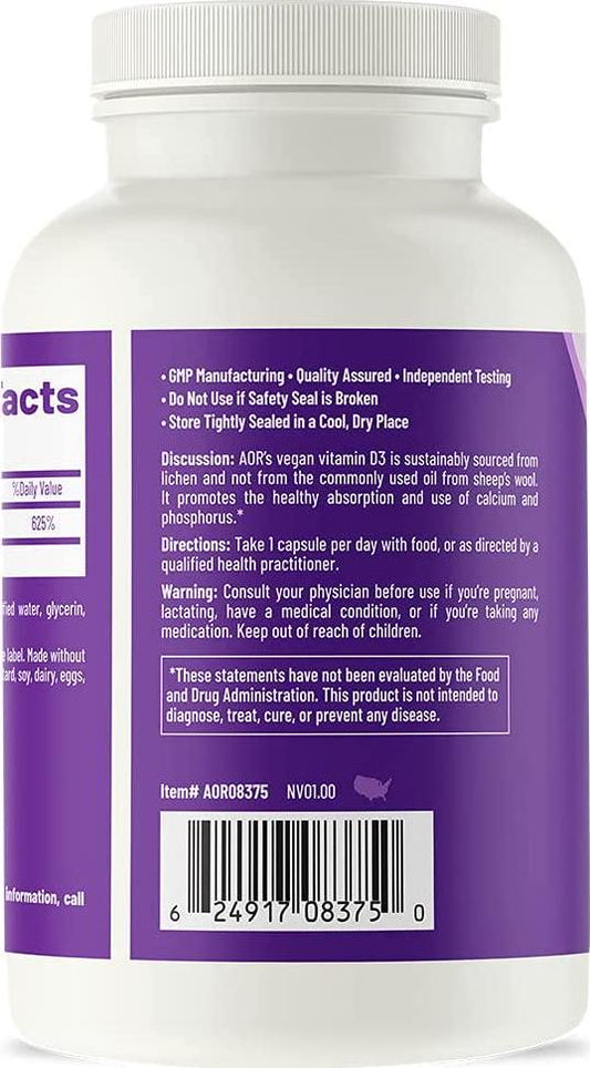 AOR, Vitamin D3 5000 IU, Vegan, Supports The Immune System and Mood Balance, Ensures Proper Calcium Absorption, 120 Servings (120 Softgels)