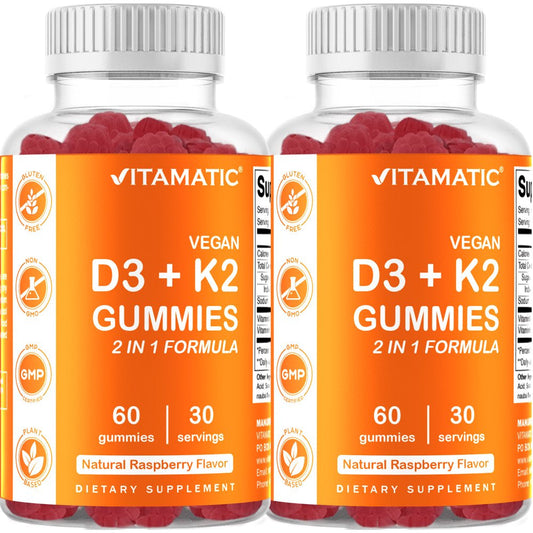 2 Pack - Vitamatic Vitamin D3 K2 Gummies - 60 Count - Supports Healthy Bone, Heart & Calcium Absorption, & Immune Health - Plant Based, Non-Gmo, Gluten Free