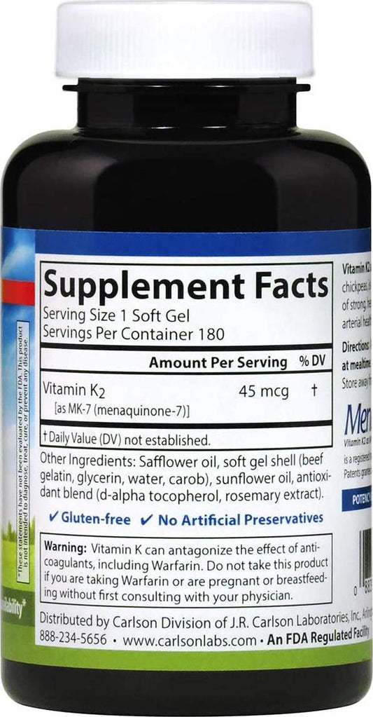 Carlson - Vitamin K2 MK-7 (Menaquinone), 45 mcg, Bone Support, Cardiovascular Function and Calcium Bioavailability, 180 Softgels