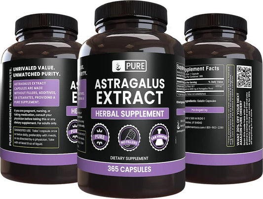 100% Pure Astragalus Extract, 365 Capsules, 420 mg Serving, Natural, No Fillers, Non-GMO, Made in USA, Cardiovascular and Immunity Support, Lab-Tested Potency by Pure