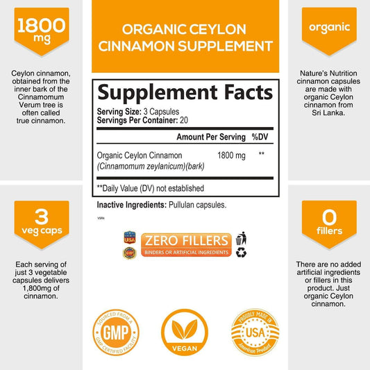 Certified Organic Ceylon Cinnamon (Made with Organic Ceylon Cinnamon) 1800mg - Organic Sri Lanka Ceylon Cinnamon Powder Caps - Best Vegan True Cinnamon Cinnamomum Verum Vitamins - 60 Capsules