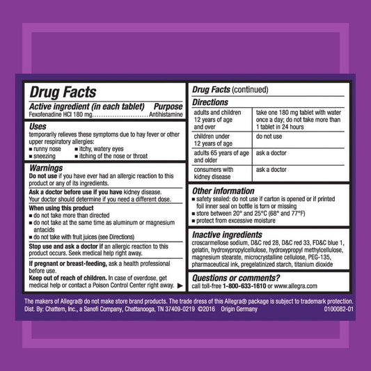 Allegra Adult Hives 24 Hour Non-Drowsy Antihistamine Allergy Relief Medicine 180Mg Tablets 30Ct