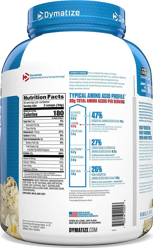 Dymatize Athlete's Whey Protein Powder, 30g of Protein, 6.6g BCAAs, Banned Substance Tested and Gluten Free, Chocolate Shake, 4 Pound