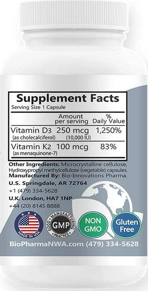 Bio-Innovations Pharmacal D3+K2 10,000IU D3 Cholecalciferol 100mcg, MK7 Nattokinase Bone, Neuromuscular, Cardiovascular and Immune Support, Promotes Calcium Homeostasis, Allergen Free 120 Capsules