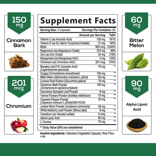 Glucose Support Complex, Advanced Extra Strength Herbal Supplement with Cinnamon, Alpha Lipoic Acid and Chromium - 20 Herbs and Vitamin Blend - Best Vegan Complex - 60 Capsules
