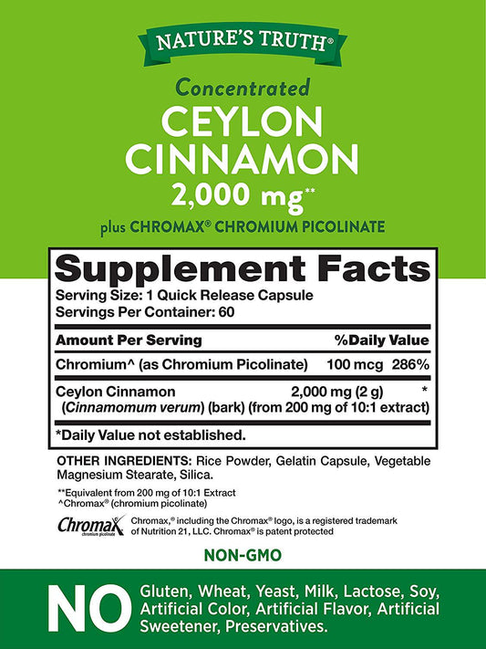 Ceylon Cinnamon Capsules | 2000mg | 60 Count | Non-GMO and Gluten Free | Plus Chromium | by Natures Truth