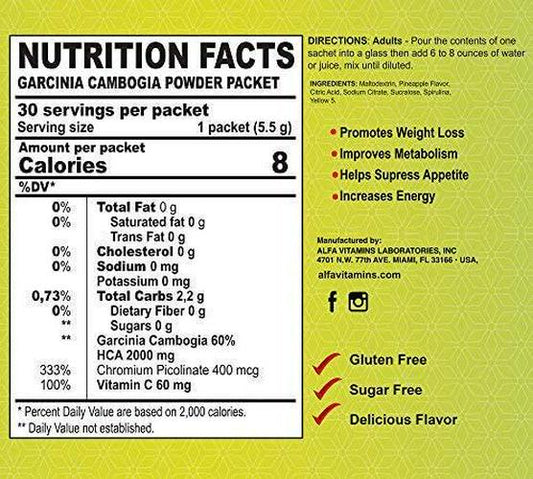 ALFA VITAMINS Best Garcinia Cambogia 2000mg per Serving - 60% HCA PLUS Chromium 400mcg - Powder Supplement - Premium Quality Source of weight control, Vitamin C 100% DV - pure and natural - 30 Sachets