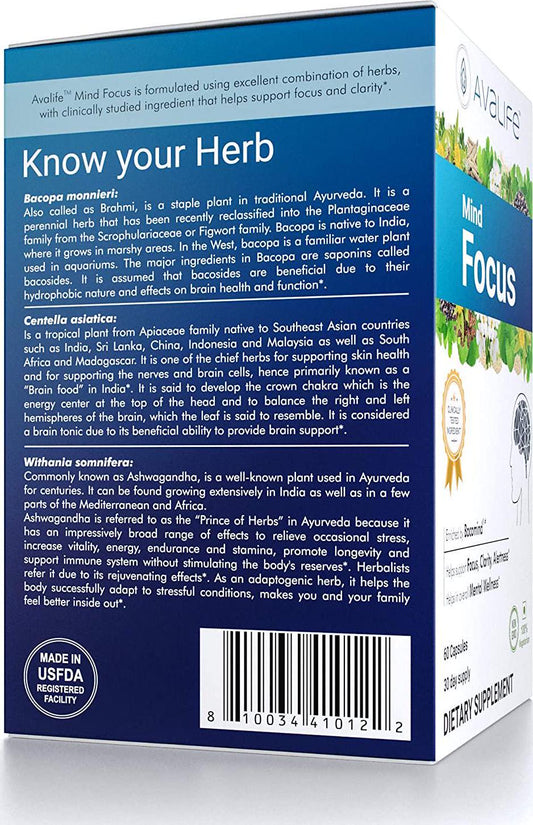 Avalife Mind Focus - Natural Brain Focus Supplements for Focus, Energy and Clariy for Men and Women - Gluten Free, Vegan and Non-GMO - 60 Capsules