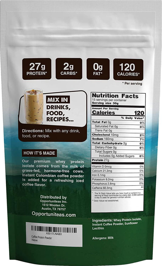 Coffee Protein Powder - Grass Fed Whey Isolate + Colombian Coffee - Low Carb and 60mg Caffeine - Boost Energy Pre or Post Workout - Keto Friendly Drinks, Lattes, Shakes, Smoothies and Recipes - 1 Pound