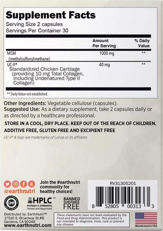 EarthNutri UC-II + MSM/Joint Health Supplement // 40mg UC-II Providing 10mg Total Collagen Including Undenatured Type II Collagen and 1000mg MSM with NO Additive Individually Blister Sealed