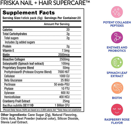 FRISKA Nail and Hair Supercare | Biotin and Collagen Supplements Beauty Boost | Digestive Enzyme and Probiotics for Women | Raspberry Rose Flavor | 20 Stick Packs