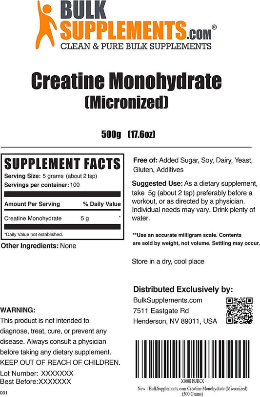 BulkSupplements.com Creatine Monohydrate Powder - Creatine Powder - Muscle Building Supplements - Creatine Supplements - Pre Workout Women - Micronized Creatine (500 Grams - 1.1 lbs)
