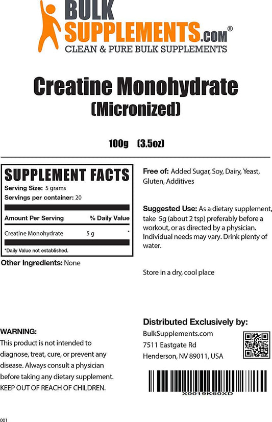 BulkSupplements.com Creatine Monohydrate Powder - Muscle Building Supplements - Creatine Powder - Weight Gainer for Women - Vegan Pre Workout - Weight Gain Supplements (100 Grams - 3.5 oz)