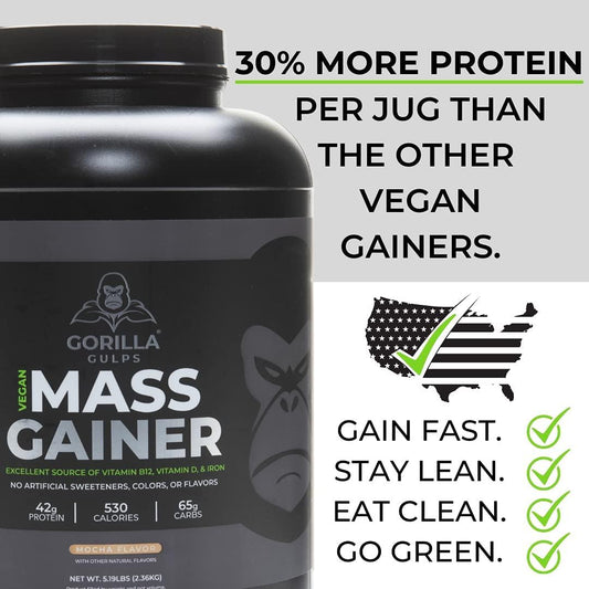 Gorilla Gulps Mocha Vegan Mass Gainer 5 lb Natural High Calorie Protein Powder GMO, Gluten, Dairy, and Soy Free. No Artificial Ingredients Vitamin B12 + D3, and Iron 530 Calories 18 Servings