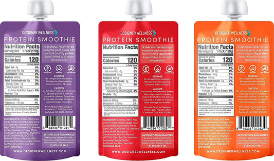 Designer Wellness Protein Smoothie, Real Fruit, 12g Protein, Low Carb, Zero Added Sugar, Gluten-Free, Non-GMO, No Artificial Colors or Flavors, Variety Pack, 12 Count