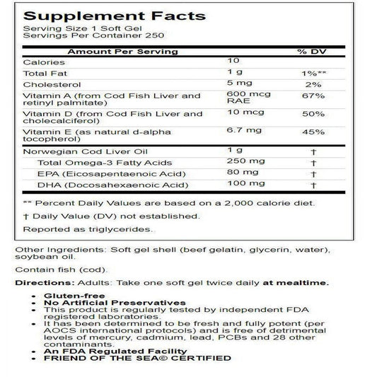 Carlson - Cod Liver Oil Gems, Super 1000 Mg, 250 Mg Omega-3S + a & D3, Norwegian, Wild Caught, 250 Softgels