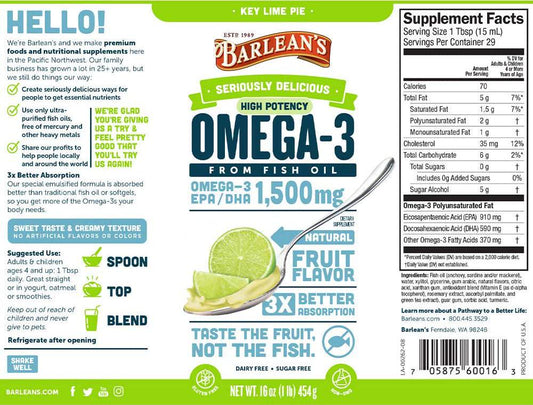 Barlean's Key Lime Pie High Potency Omega 3 Fish Oil Supplements - 1500mg of Omega 3 EPA/DHA for Brain, Heart, Joint, and Immune Health - All Natural Fruit Flavor, Non GMO, Gluten Free - 16-Ounce
