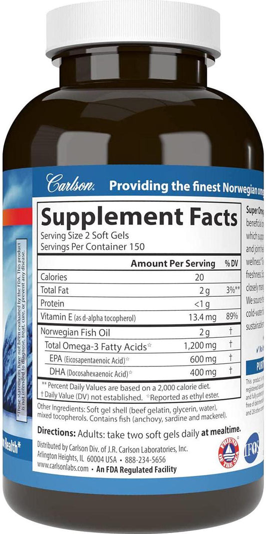 Carlson - Super Omega-3 Gems, 1200 mg Omega-3 Fatty Acids with EPA and DHA, Wild-Caught Norwegian Fish Oil Supplement, Sustainably Sourced Fish Oil Capsules, Omega 3 Supplements, 300 Softgels