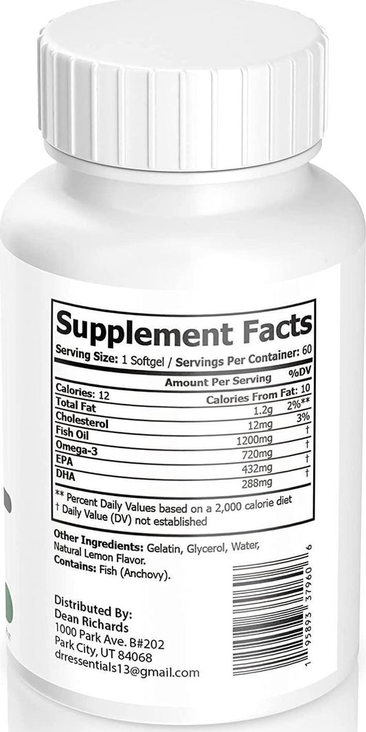 DRR Essentials Omega 3 Fish Oil Supplement Pack of 60 Soft Gels, 1200mg - Lemon Flavor | DHA and EPA Fatty Acids | Heart and Brain Support | GMP Certified