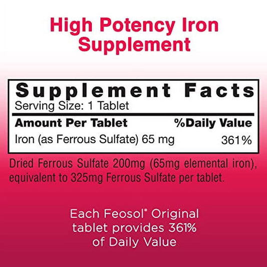 Feosol Original Iron Supplement Tablets, Non-Heme, 325Mg Ferrous Sulfate (65Mg Elemental Iron) per Iron Pill, 1 per Day, 120Ct, 4 Month Supply, for Energy and Immune System Support, Made in USA