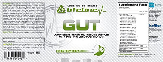 Core Nutritionals Lifeline Gut Comprehensive Gut Microbiome Support with Pre-, Pro-, and Post-Biotics, 150 Capsules
