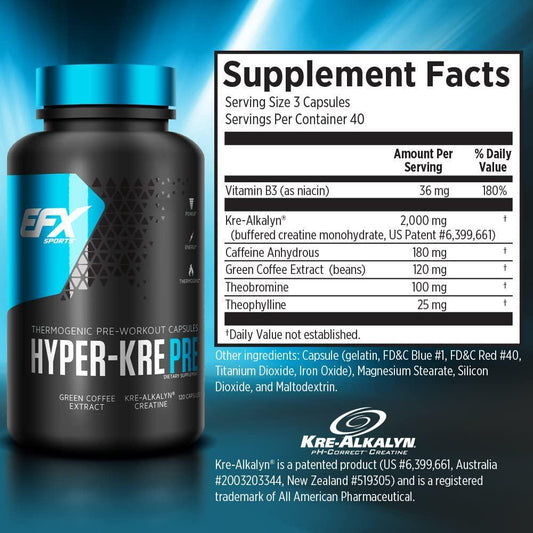 EFX Hyper-Kre Pre | PH Correct Creatine Monohydrate Preworkout Formula | Patented Formula, Gain Strength, Build Muscle and Enhance Performance | (120 Capsules)