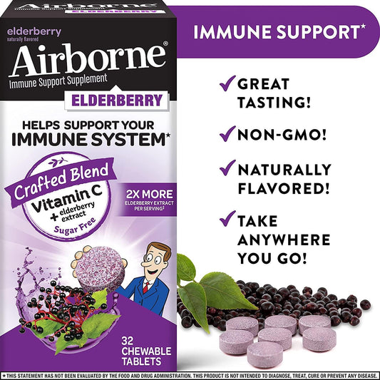 Elderberry Extract + Vitamin C - Airborne Chewable Tablets (32 count in a bottle), Non-GMO Immune Support Supplement, Sugar Free, Naturally Flavored, No Color Added, Sambucus, Antioxidants