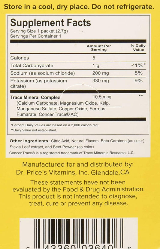 Dr. Price's Vitamins Electrolyte Mix Supplement Powder, 72 Trace Minerals, Potassium, Sodium, Electrolyte Replacement Keto Drink | Lemon-Lime 30 Packets | No Sugar, Keto, Vegan, Non-GMO, Gluten-Free