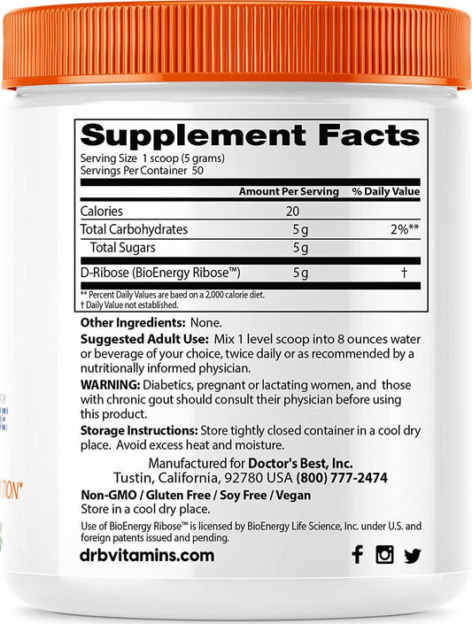 Doctor's Best D-Ribose with Bioenergy Ribose, Non-GMO, Vegan, Gluten Free, Energy Enhancement, 250g, 8.8 Ounce (Pack of 1)