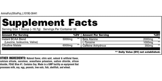 Animal Fury - Pre Workout Powder Supplement for Energy and Focus - 5g BCAA, 350mg Caffeine, Nitric Oxide, Without Creatine - Powerful Stimulant for Bodybuilders - Ice Pop - 30 Servings