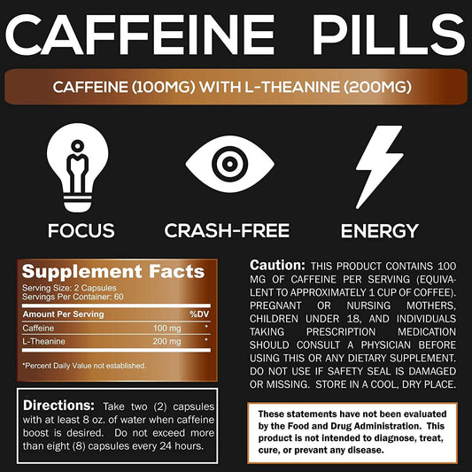 Caffeine Pills with L-Theanine - 120 Capsules - Energy and Focus Supplement - 100mg Caffiene and 200 mg LTheanine Per Serving