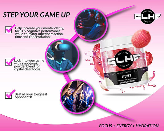 GLHF Gamer Energy Nootropic Drink Mix - Energy and Focus Supplement Powder for Increased Performance and Endurance (Lychee)