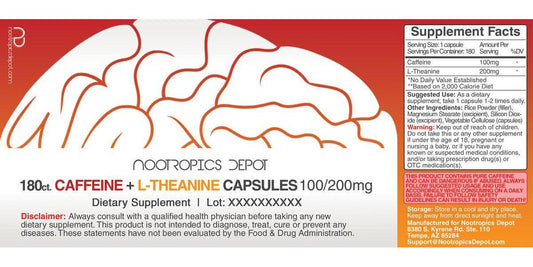 Caffeine L-Theanine Capsules | 180 Pills | Contains 100mg of Caffeine and 200mg of L-Theanine | Nootropic Brain Booster | Energy Supplement | Increase Mental Focus + Alertness | Tea Alternative