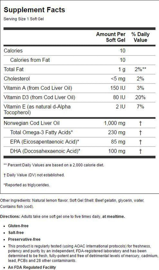 Carlson - Cod Liver Oil Gems Bonus Pack 150 Soft Gels + 30 Free Soft Gels Lightly Lemon 1000 Mg. - 180 Softgels
