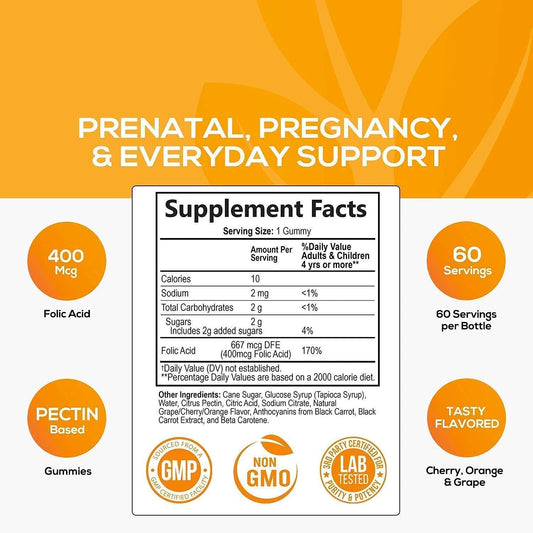Folic Acid Gummies for Women 400mcg, Essential Support for Mom and Baby, Extra Strength Prenatal Vitamins, Chewable Folate Nutrition Supplement for Before, During, and After Pregnancy - 60 Gummies