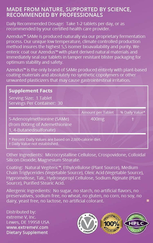 Azendus SAM-e Mood Support 400mg, 30 Count, Same Butanedisulfonate Fiber Enteric Coated Tablets