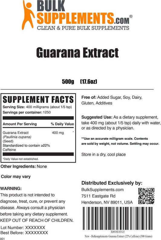 BulkSupplements.com Guarana Extract (22% Caffeine) - Caffeine Supplement - Caffeine Supplements - Caffeine Powder for Water (500 Grams - 1.1 lbs)