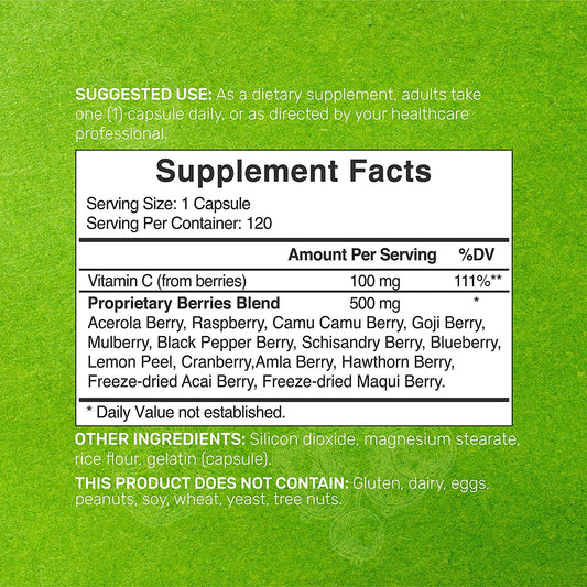 100% Natural Vitamin C Capsules from Berries and Fruits, Vitamin C 100mg (Non-Synthetic Ascorbic Acid) Per Serving, 120 Caps, Immune Support
