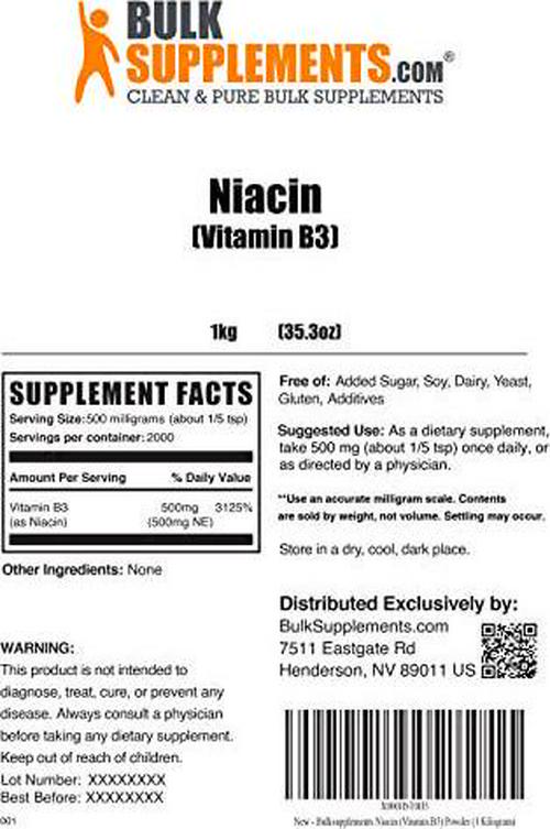 BulkSupplements.com Flush-Free Niacin (Inositol Hexanicotinate) Powder (1 Kilogram - 2.2 lbs)
