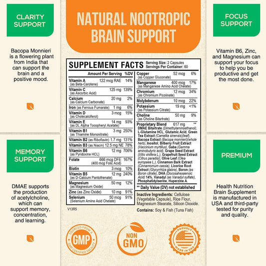 Brain Support Supplement Extra Strength Nootropics 1000mg - Made in USA - Natural Support for Memory, Focus, Concentration, and Clarity with Bacopa Monnieri for Men and Women - 120 Capsules