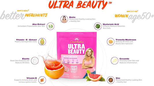 Denise Austin's Ultra Beauty Collagen Water Enhancer, Grapefruit Flavor (7 oz Bag - 30 Servings) Grass Fed Peptides and Essential Vitamins for Skin Hair Nail Joint Health
