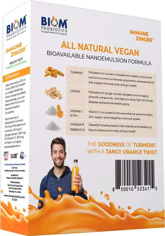 Biom Probiotics Immune Zinger with Bioavailable Turmeric -Ginger Extract in Water dispersible Form. Added Zinc, Vitamin C and Gut Health Prebiotics