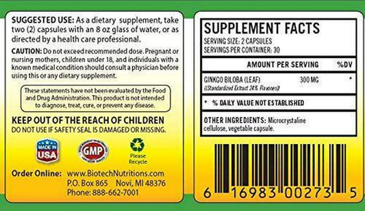 Biotech Nutritions Ginkgo Bilob Capsules, 60 Count