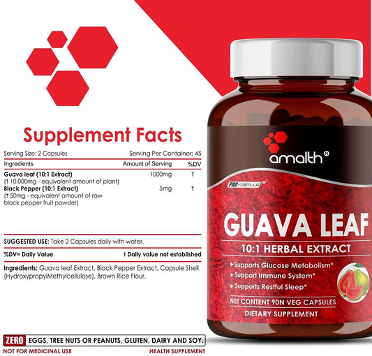 Amalth Guava Leaf Extract Equivalent to 10000mg Enhanced Maximum Absorption with Piperine Support Anxiety Relief, Glucose Metabolism, Sleep Aid, Blood Sugar for Hair Regrowth 90 Capsules