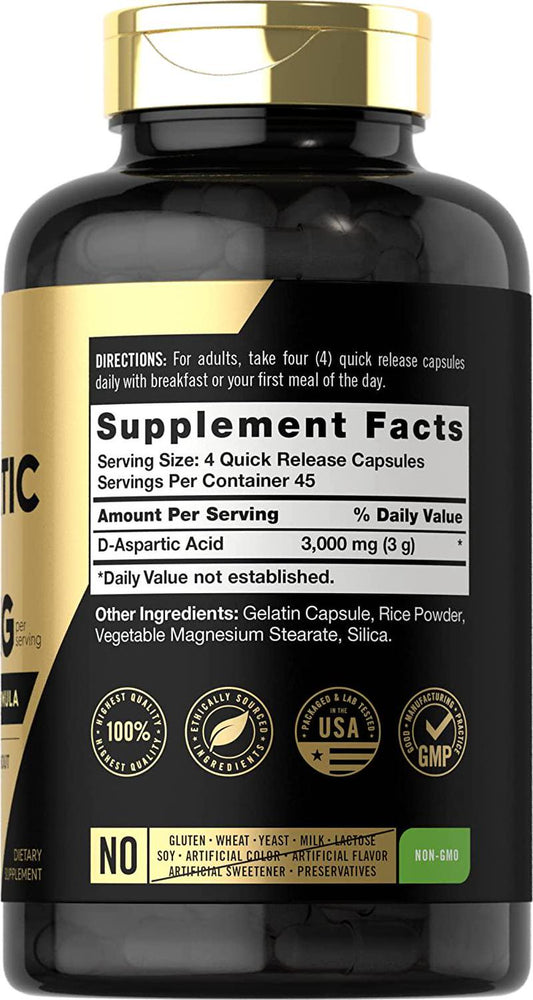 D Aspartic Acid Capsules (DAA) | 3000mg | 180 Count | Non-GMO, Gluten Free Supplement | Advanced Athlete Formula | by Carlyle