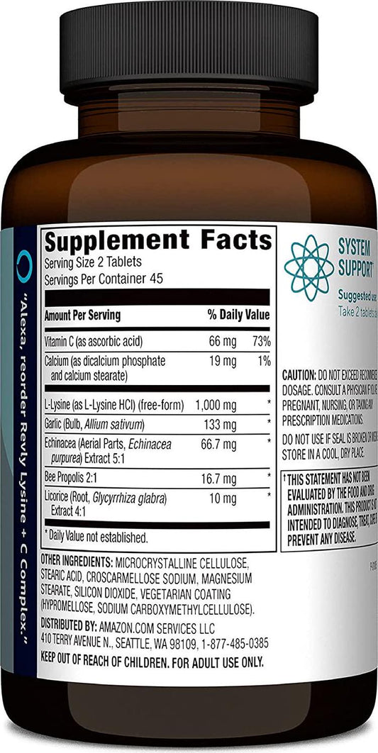Brand - Revly Lysine + C Complex, 1000 mg L-Lysine and 66 mg Vitamin C per Serving (2 Tablets), Supports Immune Health, 90 Tablets, Gluten Free