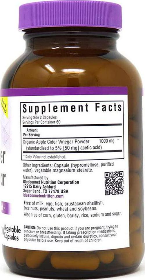 Bluebonnet Nutrition Apple Cider Vinegar, Soy-Free, Gluten-Free, Non-GMO, Dairy-Free, Kosher Certified, Vegan, 120 Vegetable Capsules, 60 Servings