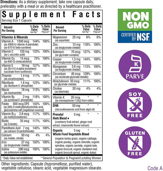 Bluebonnet Nutrition Ladies’ ONE Prenatal - Whole Food-Based - for Women Trying to Conceive, Pregnant or Nursing - Soy-Free, Gluten-Free, Kosher, Non-GMO – 30 Vegetable Capsules, 30 Servings