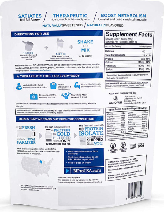 BiPro Renew 100% Whey Isolate Protein Powder, Vanilla, 1 Pound - Dietitian Recommended, Sugar Free, Suitable for Lactose Intolerance, Gluten Free, Naturally Sweetened, Hormone Free